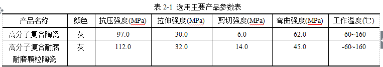 (2)高分子顆粒陶瓷是一種雙組份、填充陶瓷小顆粒、高性能表面涂層材料,主要成分是碳化硅、金屬碳化物和超硬陶瓷,具有良好的耐磨蝕和腐蝕性能,作為耐磨蝕和耐腐蝕保護涂層被廣泛的應用于各種化工設備及通用設備。適合應用于灰漿泵、水泵、風機、水輪機蝸殼、凈化煙道、氧化鋁粉輸送管道等內壁防腐耐磨局部或大面積修復。